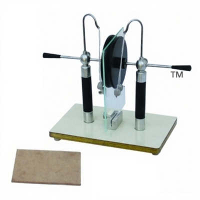 A rectangular glass plate is supplied which mounts in clips between the two discs & may be easily replaced by a plate of some other material to show the effect of different dielectrics. The whole is mounted on a polished wooden base.