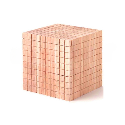 Wooden cube of size 10cm, made of hard wood, precisely cut and finished, having a total volume of 1dm³ or 1000cm³. Each face of the cube has a square grid of 10×10, total 100 squares of 1cm each. 1st row and 1st column of grid on each face marked 1 to 10.