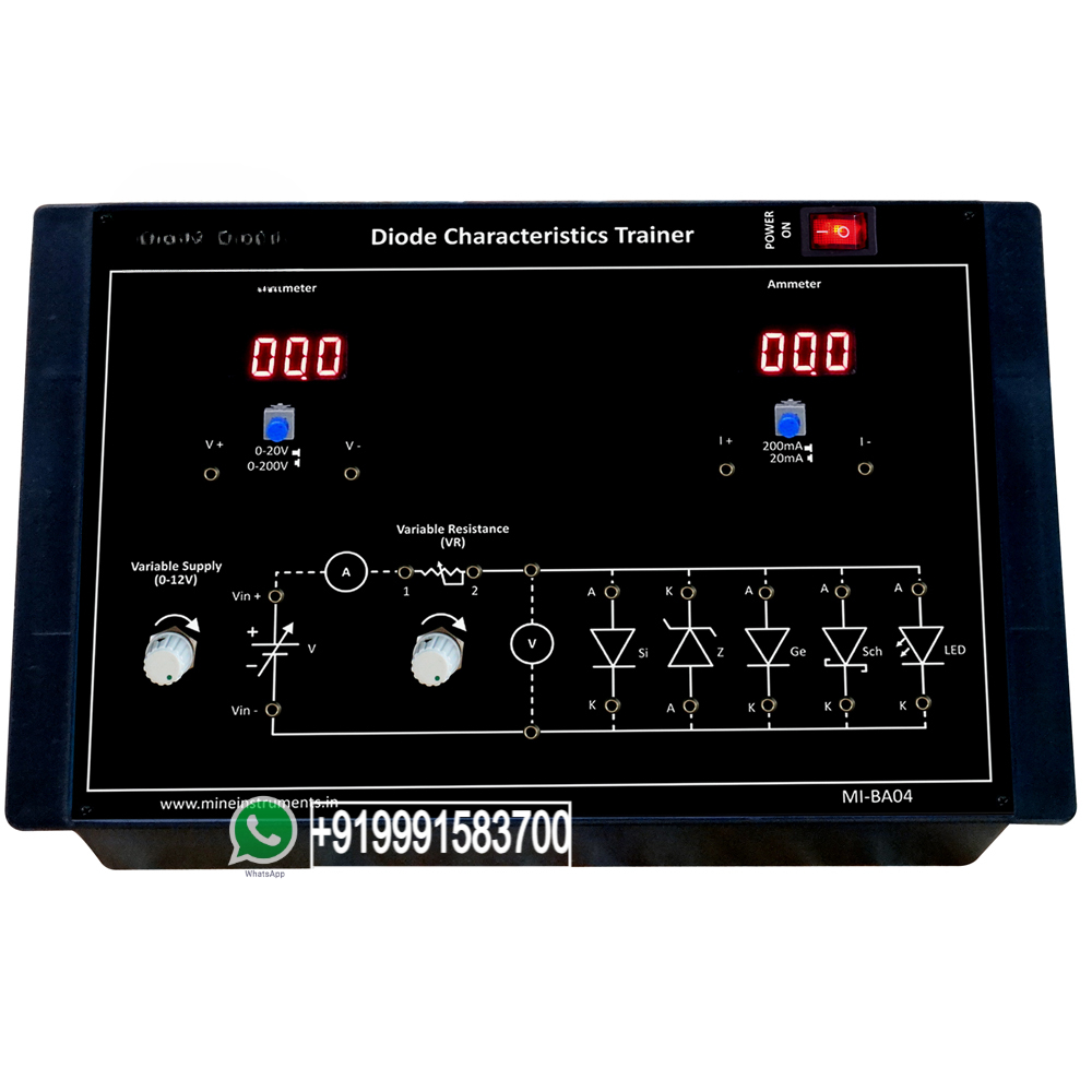 Diode Characteristic TrainerĀ is useful to understand basic concept of Diode Characteristics. This kit has five number of different diodes, through which user can observe the Input and Output characteristic of different diodes. This kit comes with built-in variable DC Power Supplies with set of built-in DC Voltmeter, Ammeter and a variable resistance . This trainer consists of Silicon Diode, Germanium Diode, Zener Diode, Light Emitting Diode (LED) & Fast Switching Diode.