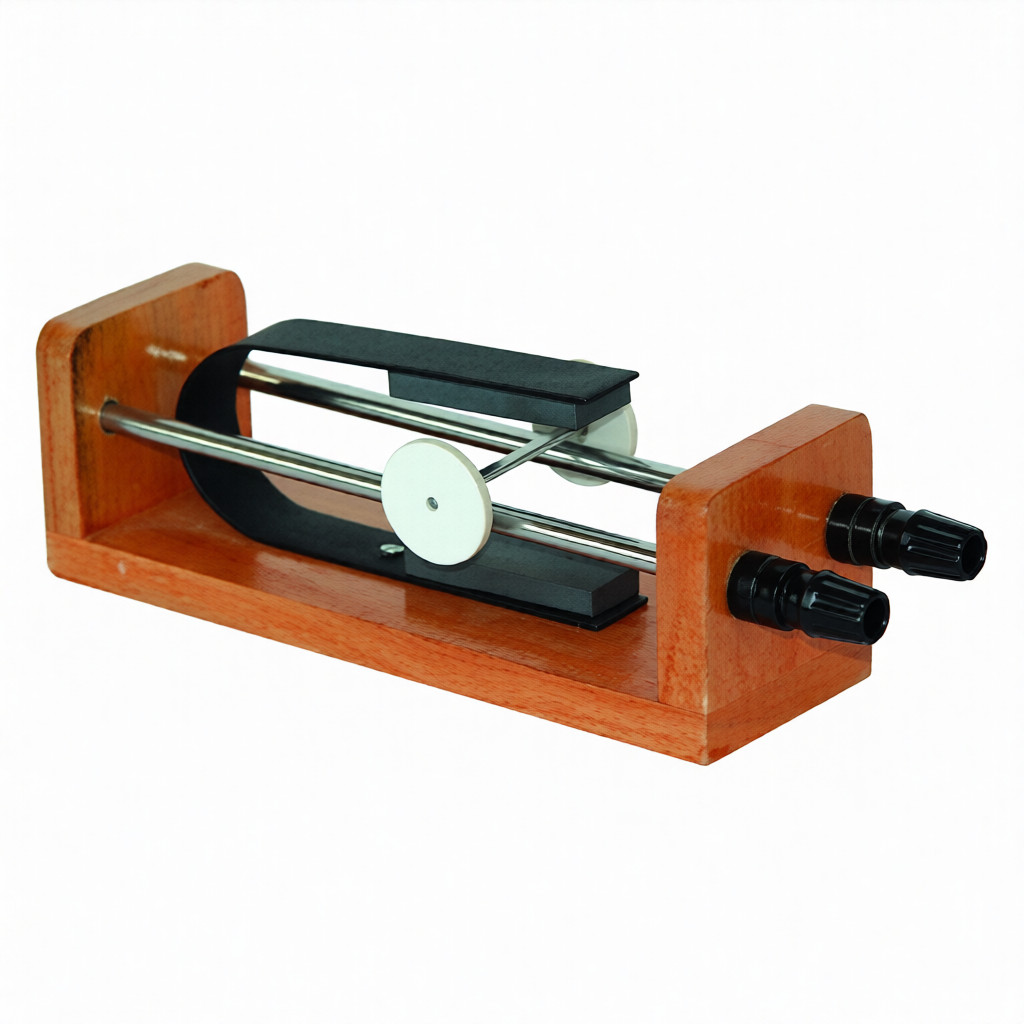 Apparatus To Show Force On Conductor In Magnetic Field – Comprising a strong U-shaped magnet and a pair of brass rails with 4mm socket terminals. A brass axle with plastic discs is free to roll along the rails and completes the electrical contact