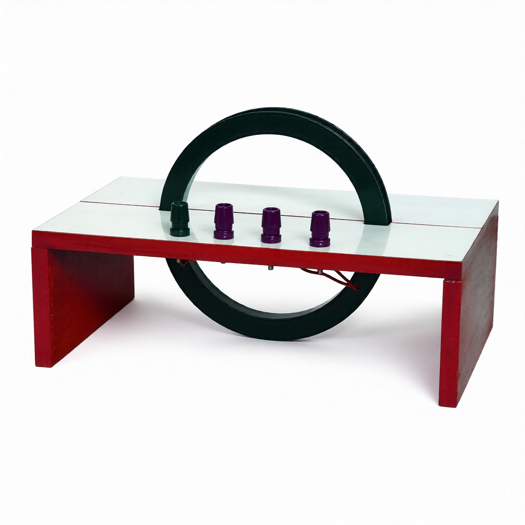 Magnetic Field Table for Physics Lab A wooden table supports an aluminium ring wound with three coils of 18 SWG enamelled copper wire of 5, 10 & 20 turns respectively, connected to bakelite 4 mm socket terminals at one edge of the board.