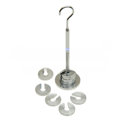 Made of steel. This set includes nine slotted masses each of 50 g with a 50 g wire hanger making total mass of 500 g; masses do not fall off when assembled in a set. Tolerance ± 3%.
