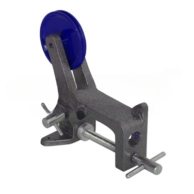 Single 50mm diameter pulley with a groove for cord mounted in universal metal frame for clamping on workbenches or boards in any position.