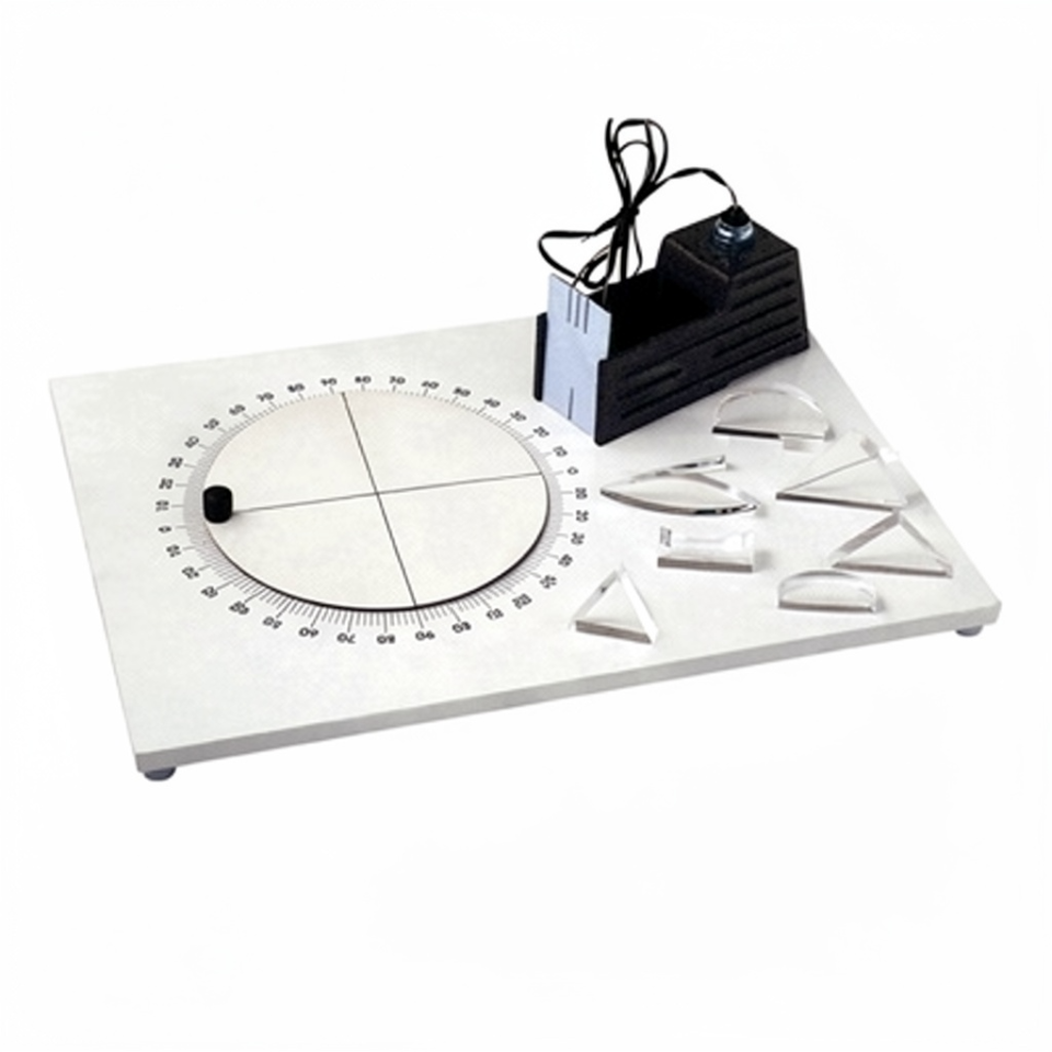 Ray Track Apparatus Manufacturer, Supplier and Exporter for Physics Lab – A compact visual teaching aid which is robust in construction wood board 400 x 280 x 13 mm with matt white surface, mounted on rubber feet carries a circular scale with four quadrants 0 – 90º graduated every 2º, with two lines at right angles.