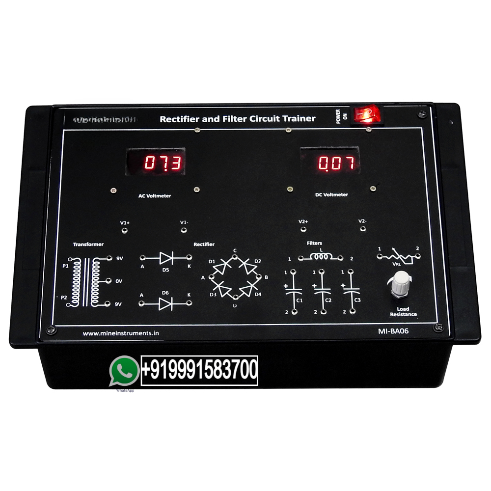 Rectifier and Filter Circuit TrainerĀ is designed to demonstrate working of different type of rectifier circuits and filters. A rectifier is an electrical device that converts alternating current (AC) to direct current (DC), which flows in only one direction. The process is known as rectification, since it controls the direction of flow of current. This is a complete kit with built-in AC Source and other required components for studying rectifiers and filters AC & DC Volt meters are available on the board to perform the experiment.