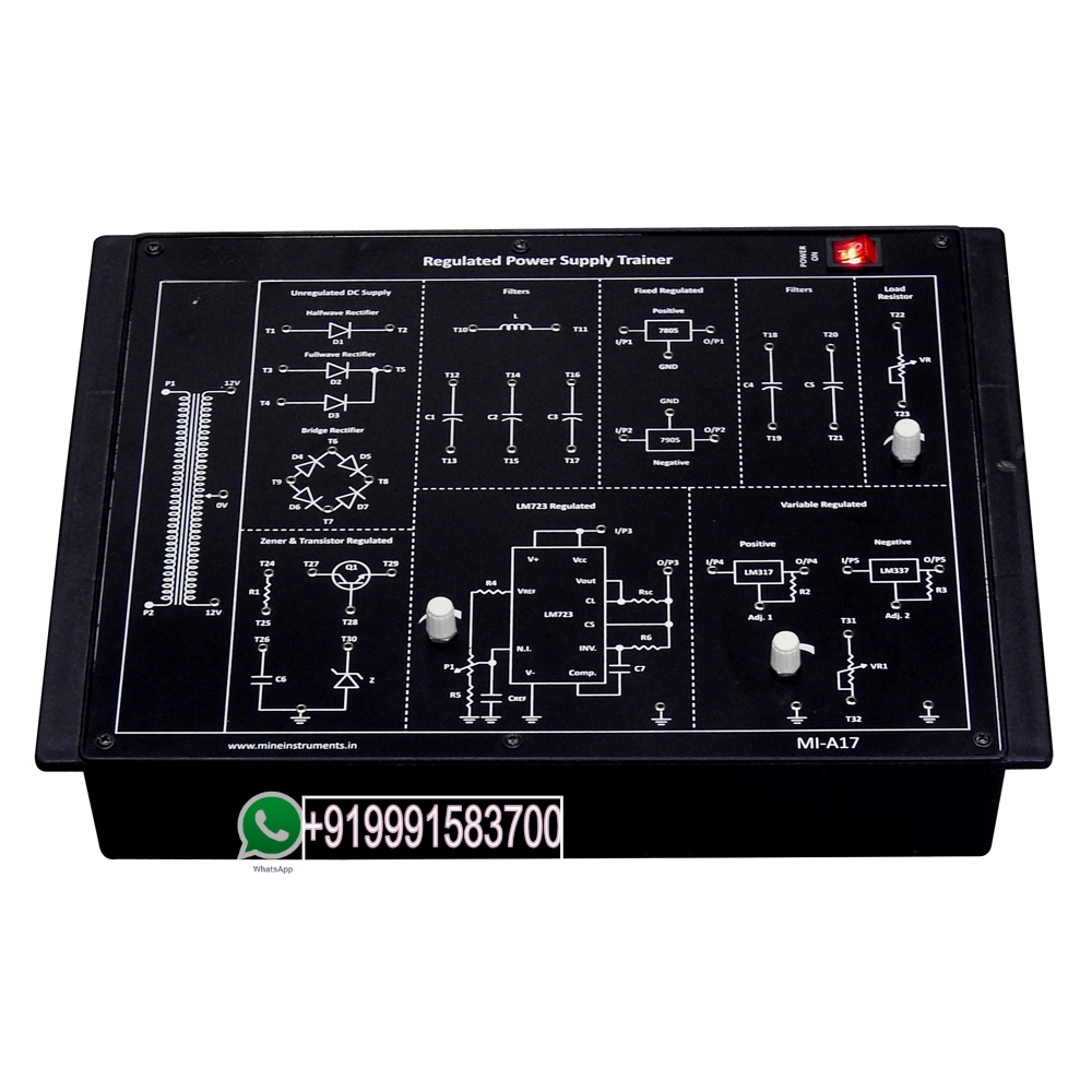 Regulated Power Supply Trainer has been designed specifically to demonstrate the importance of Regulated Power Supply. This kit is an extremely useful laboratory kit which provides facilities for hands on experience to various experiments in the field of analog electronics and provides all necessary inputs and connections for students to study rectifier, filter, based regulator power supply, ripple observation and etc.